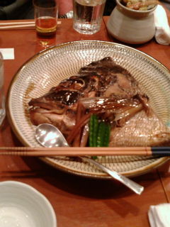 画像は、とてつなくデカい、マダイのカブト煮と若手新社長さんです。