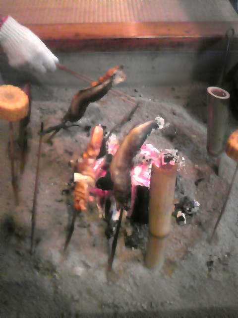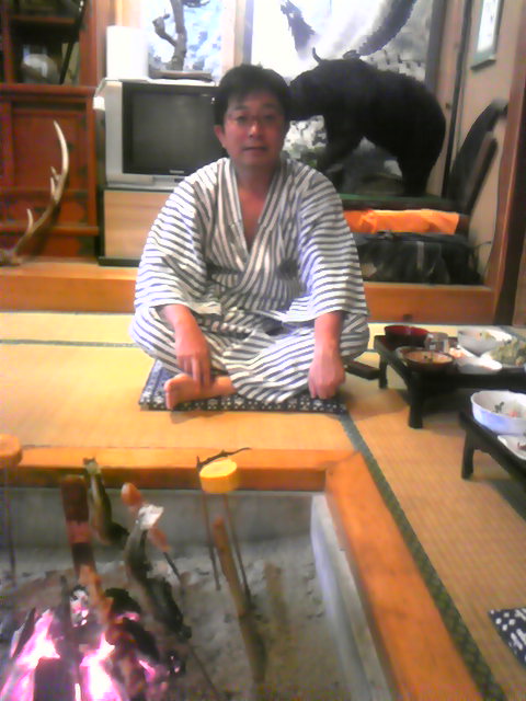 囲炉裏に、串刺した岩魚や山椒魚(これは、漢方薬っぽかった)や鶏肉を刺して、焼いて食べるのです。